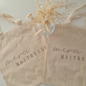 Tote bag déjà personnalisé avec inscrit “merci maîtresse” de couleur taupe.