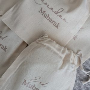 Retrouvez notre lot de 5 pochons Eid Mubarak déjà personnalisé.